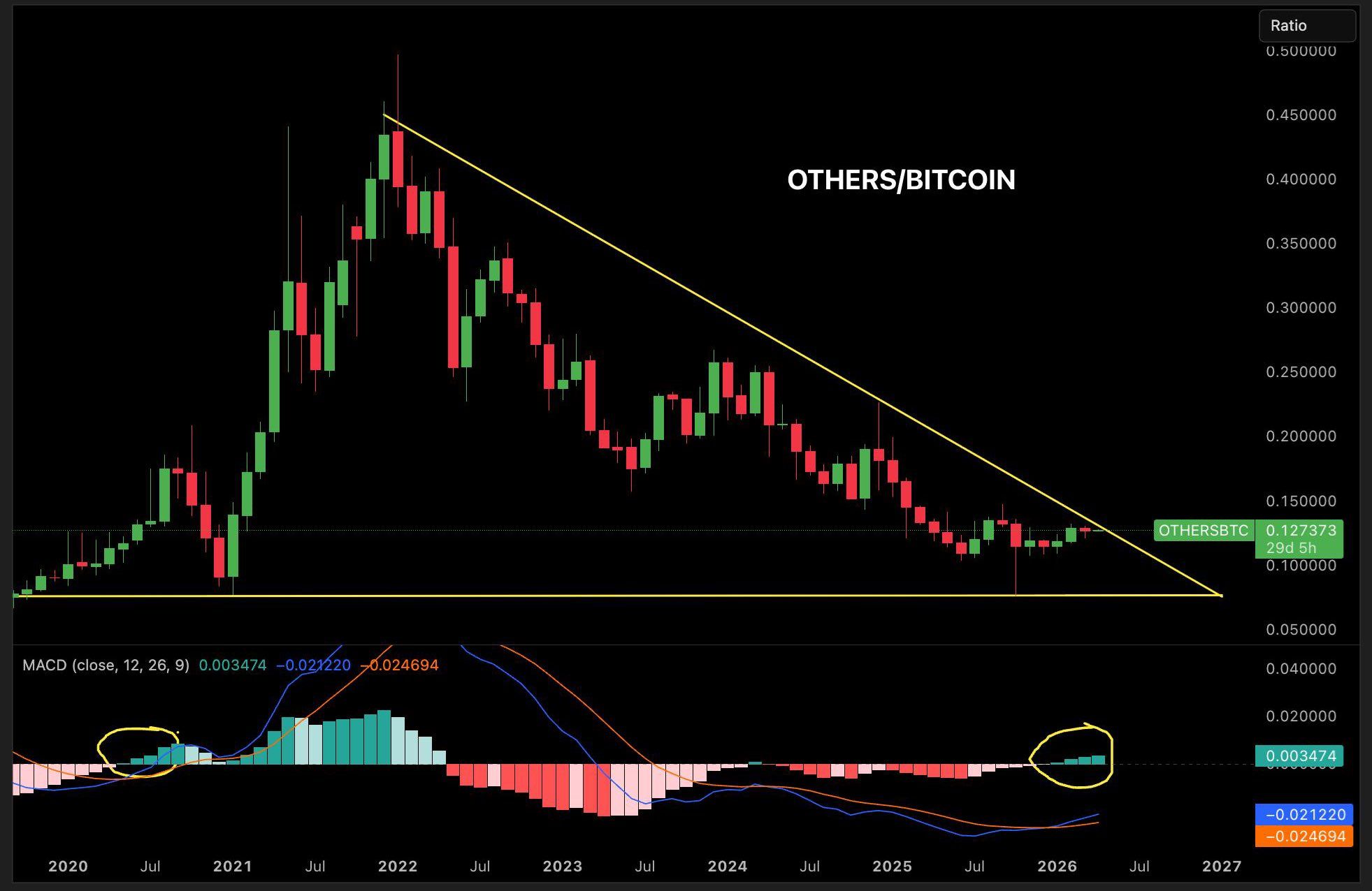 “After the 2022 bear market, $ALT/$BTC has been mostly red and oversold for nearly four years. That is why it has felt like alts never truly recovered, even when Bitcoin was making new highs. They were not recovering. Not really. Bitcoin was running alone,” he added.