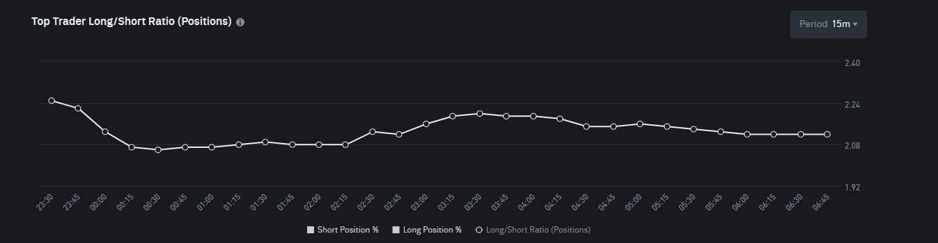 - Data from the Top Trader Long/Short Ratio by positions shows a ratio of 2.12, meaning that for every $1 short position, there is a $2.12 long position among the accounts.