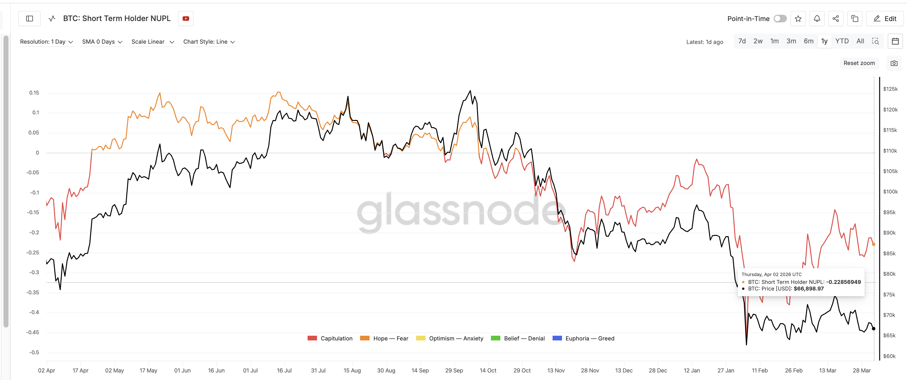 The Short-Term Holder Net Unrealized Profit/Loss (STH-NUPL), a Glassnode metric that measures whether recent buyers are collectively in profit or loss, currently reads -0.22. This places short-term participants in the capitulation zone, meaning the average recent buyer is sitting on a 22% unrealized loss.