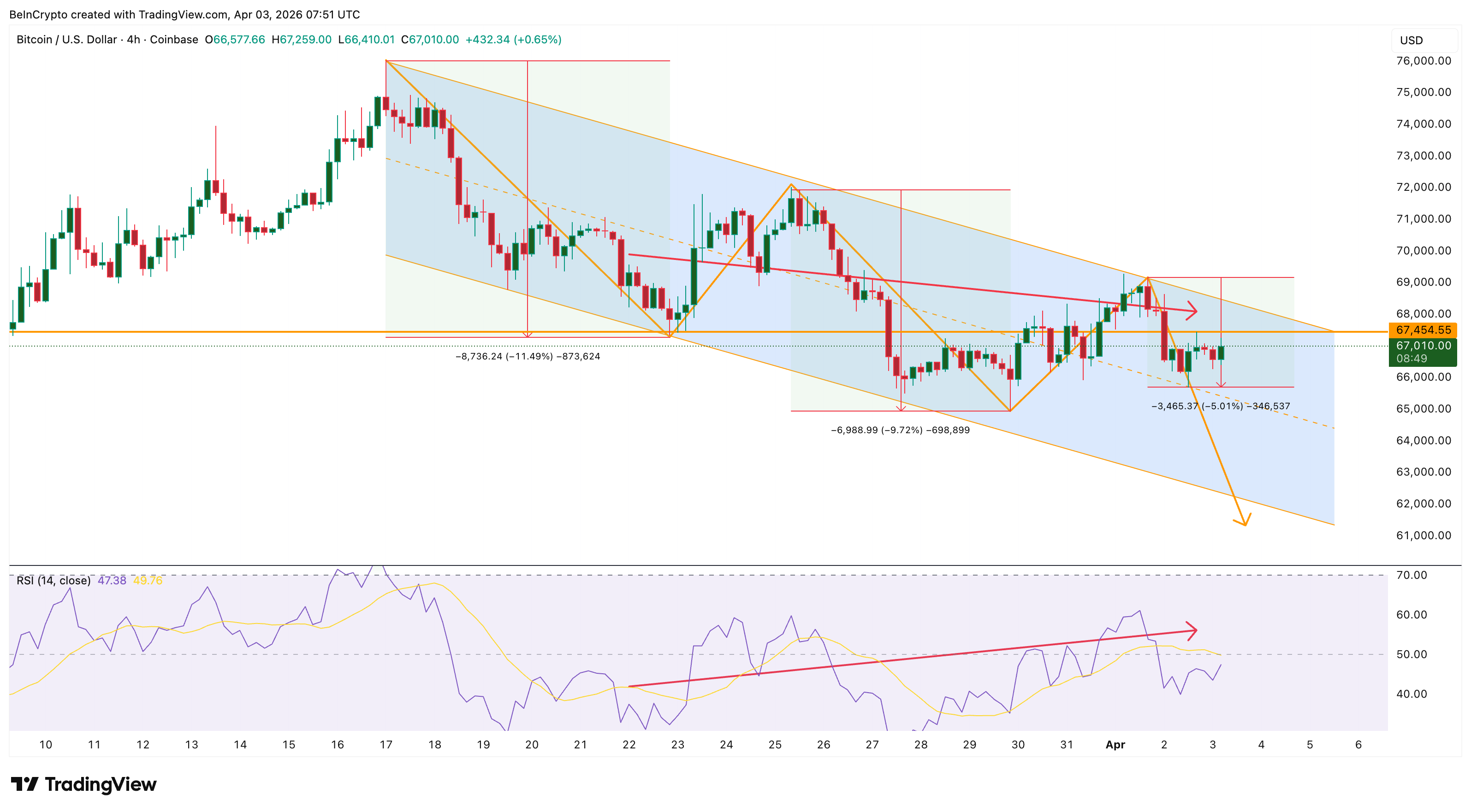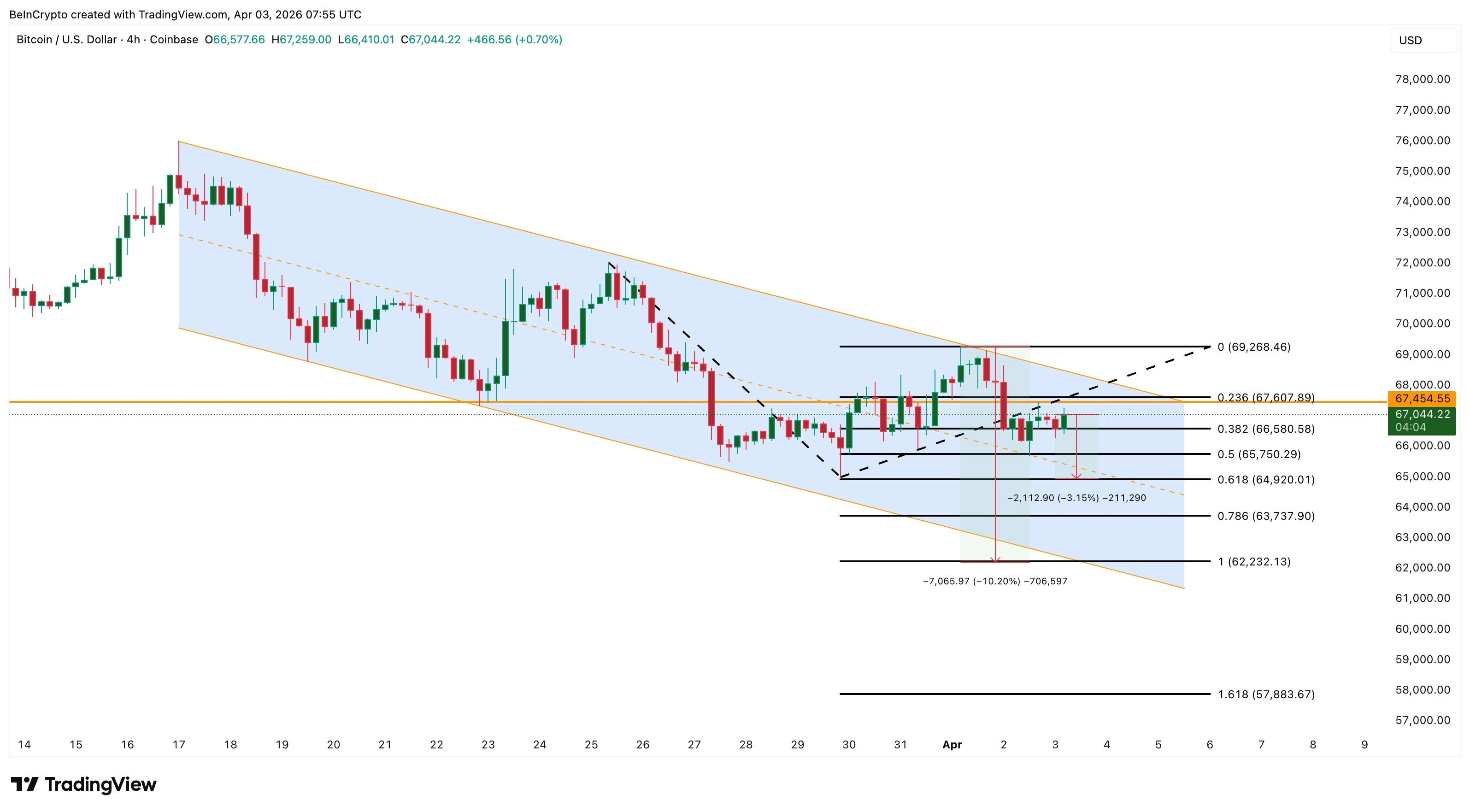 Bitcoin ($BTC) price trades near $67,044 on April 3, sitting inside a falling parallel channel on the 4-hour chart that has contained every swing since March 17.