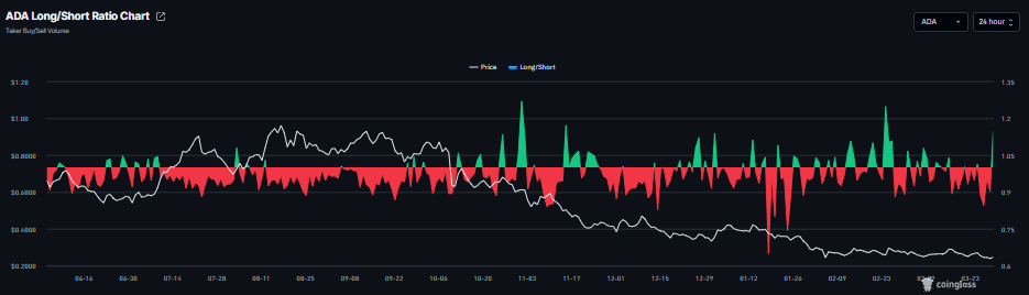 On the derivatives side, CoinGlass’s $ADA long-to-short ratio, currently at 1.14 on Monday, is near its highest level in over a month. This ratio, above one, reflects bullish sentiment in the markets, as more traders are betting on the asset price to rise.