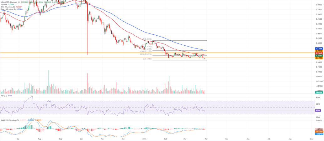 On the upside, initial resistance stands at $0.26, under the 23.6% retracement measured from the $0.42 high to the $0.22 low, followed by the horizontal barrier and prior congestion around $0.29, which aligns with the 38.2% retracement and the underside of the declining 50-day EMA. A daily close above $0.29 would be needed to challenge the current bearish tone and signal a more meaningful recovery.