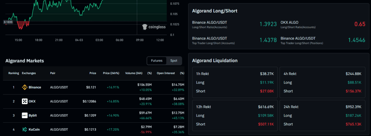- $ALGO gained 17% as bullish momentum extended its four-day rally.