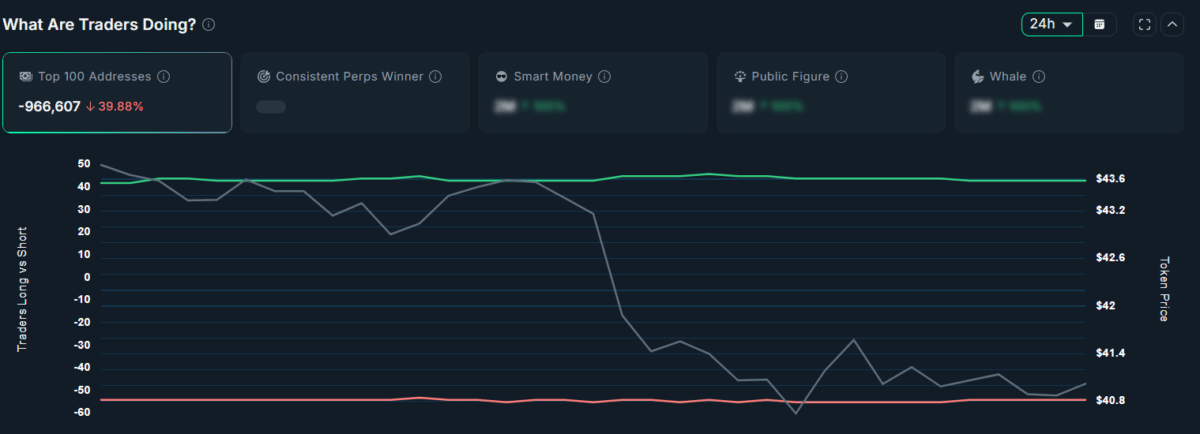 Data from analytics platform Nansen reveals that $HYPE’s top 100 addresses have reduced their holdings by 39.99%, pointing to rising selling pressure and a potential sell-off signal.