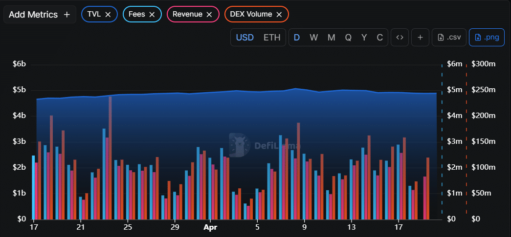 Despite the bearish sentiment, data from DeFiLlama highlights consistent strength in the protocol’s revenue, fees, and DEX volume. Recurring short-term dips followed by quick recoveries indicate sustained user activity and healthy market participation.