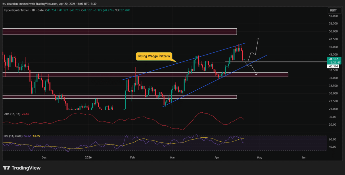 On the 20th April, $HYPE declined over 6.15%, trading at $41.05 at press time. At the same time, trading volume surged 101% to $348.95 million.