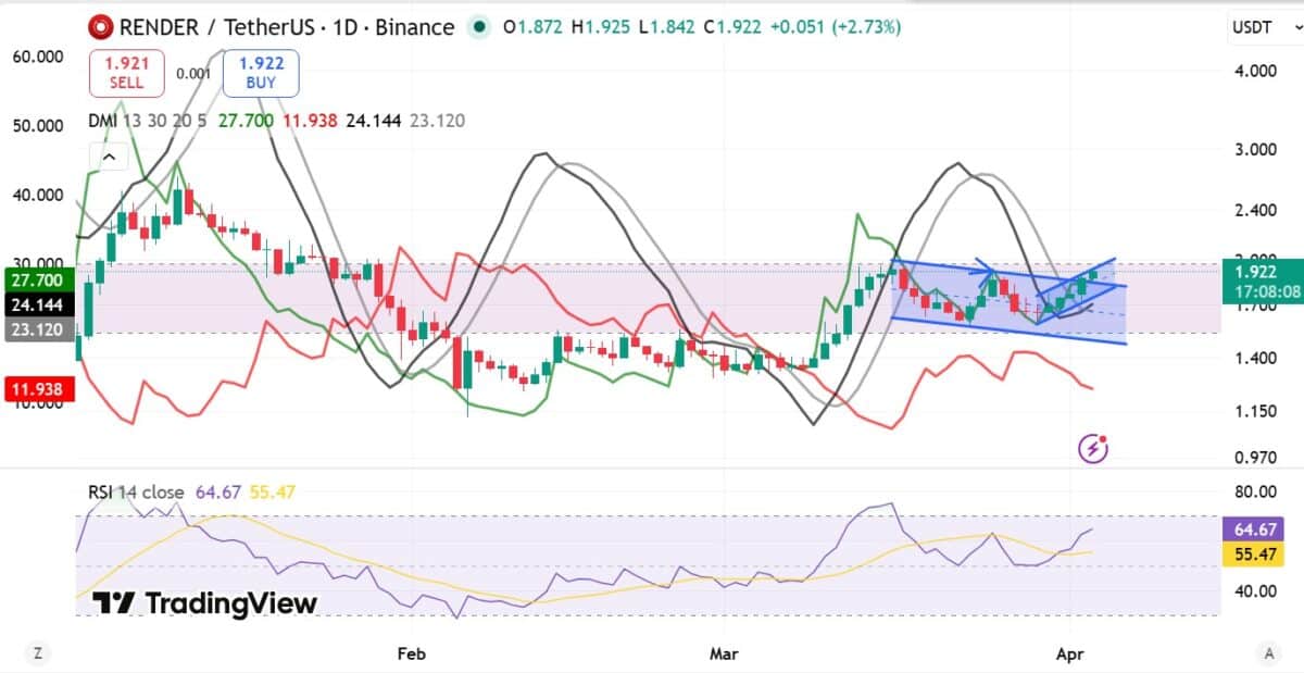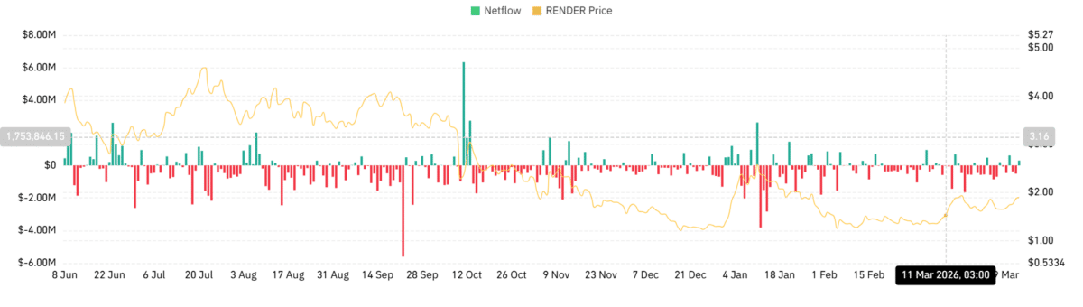 As of this writing, $RENDER traded at $1.91, up 11.23% on the daily charts, adding to its 6% weekly gains. Over the same period, the altcoin’s volume rose 48% to $81.5 million, reflecting increased market participation.