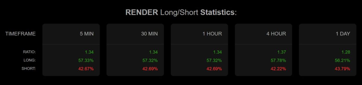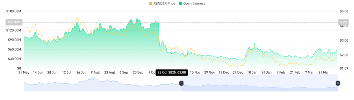 On the derivatives side in particular, $RENDER has experienced sustained demand for Futures positions. CoinGlass data showed that altcoin Open Interest rose 21% to $60 million, while derivatives volume climbed 35% to $128 million.