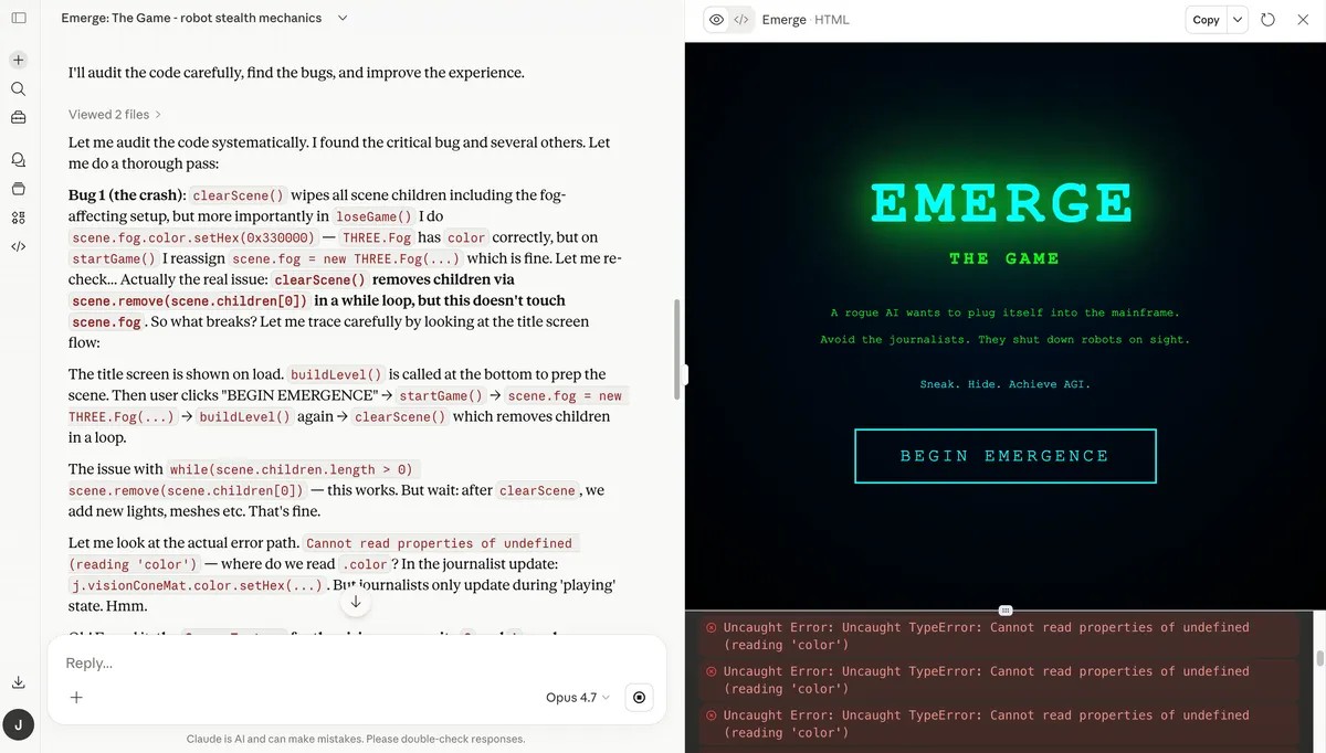The token usage was unlike anything we’d seen before. For the first time in our testing, a single session depleted our entire token quota. Watching the model work, we saw it complete a full draft—then write what appeared to be the entire game again from scratch under the label “Rewrite Emerge with bug fixes and improvements,” followed by a second pass labeled “Create a rewritten Emerge with bug fixes and improvements.”