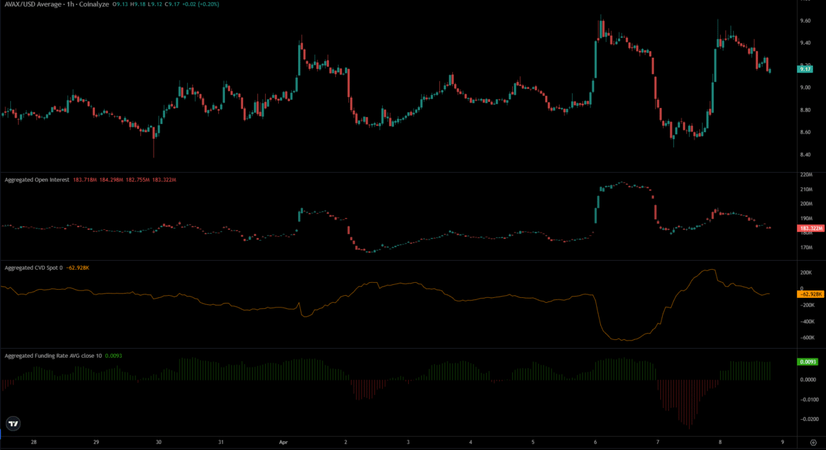 The market-wide bounce also helped $AVAX bulls. And yet, as Coinalyze data showed, the Open Interest hike was timid compared to the 13% price bounce. The OI trends showed that the first rally to the $9.6 resistance saw a much steeper OI rise compared to the second one since Monday.
