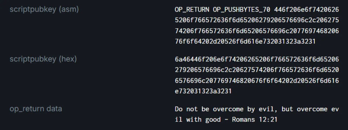The message was written using OP_RETURN, a feature in Bitcoin that allows small pieces of data to be embedded into transactions. This method doesn’t affect balances or transfers. Instead, it writes immutable data into the blockchain that anyone can verify later.