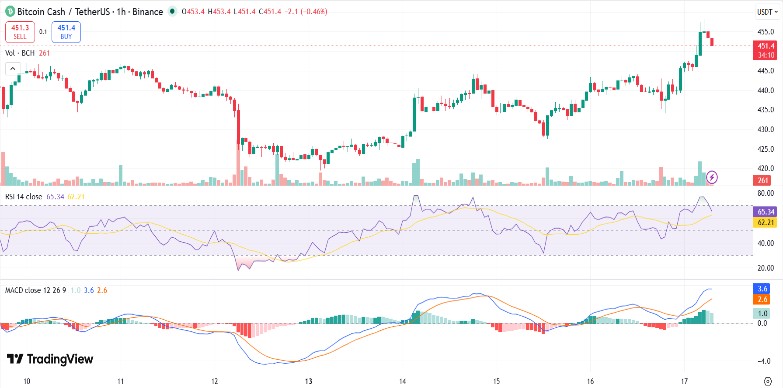 According to CoinMarketCap, Bitcoin Cash price is currently revolving around $455.74 with an impressive market capitalization of around $9.12 billion. The daily trading volume also jumped by around 18.52%, reaching $287.63 million.