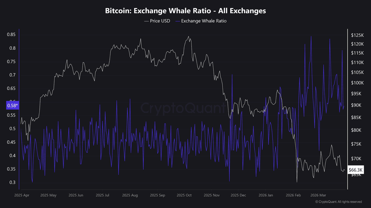 Recent CryptoQuant data showed large Bitcoin deposits moving onto Binance, often linked to potential distribution phases. At the same time, Bitcoin’s Exchange Whale Ratio climbed, signaling that large holders dominated inflows.