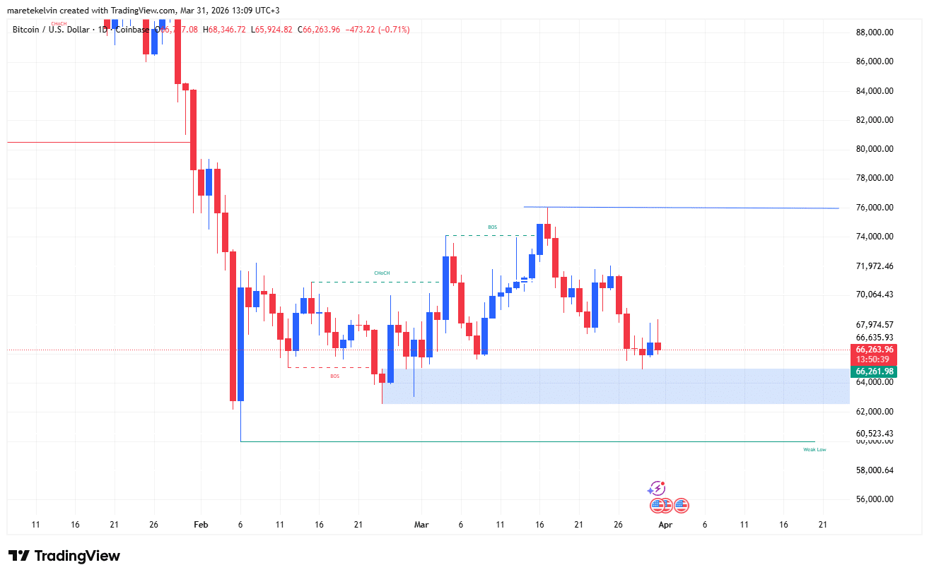 Bitcoin traded near $66.2K at press time, hovering above a key demand zone between $64K and $65K.