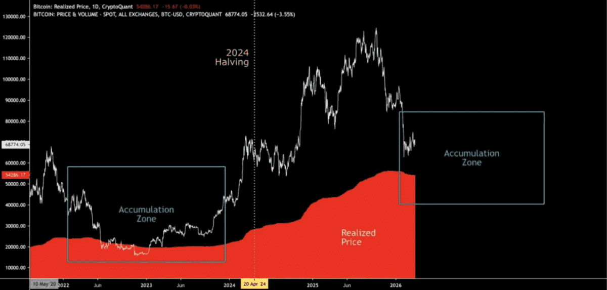 Bitcoin’s price traded within a historically significant accumulation zone, near the Realized Price range highlighted in CryptoQuant data.