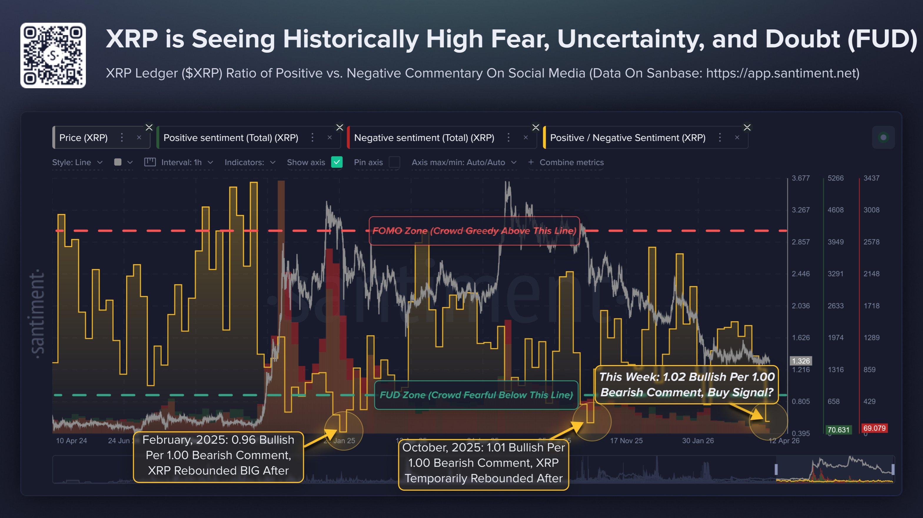 According to the analytics firm, bearish commentary around $XRP is now at its third-highest level in the past two years. Historically, this kind of sentiment imbalance has often preceded price rebounds.