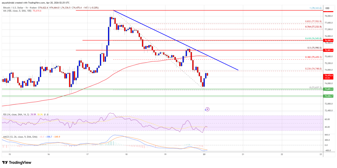 Bitcoin price started a fresh decline from the $78,400 zone. $BTC is consolidating and might struggle to stay above the $73,500 support.