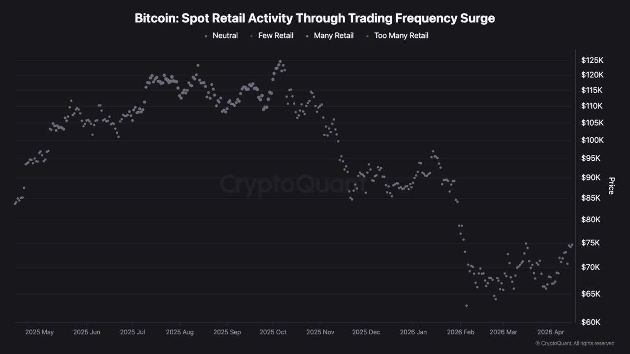 But here’s where things get interesting. Spot retail activity, seen through the trading frequency surge, is the weakest it’s been in the last year. After peaking when Bitcoin traded at the ATH range, retail participation fell and hasn’t shown any muscle since.