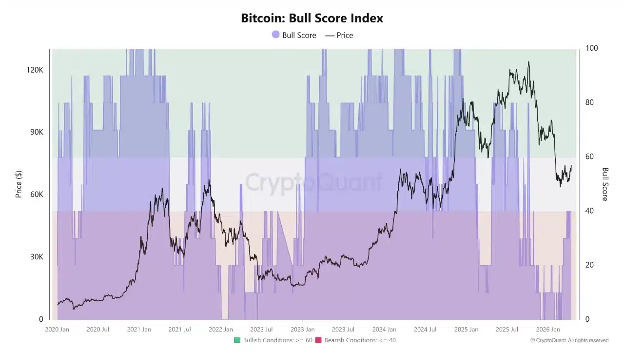 Put all that against Bitcoin’s Bull Score Index. The latest reading showed nearly 40, which is the highest number since October 2025.
