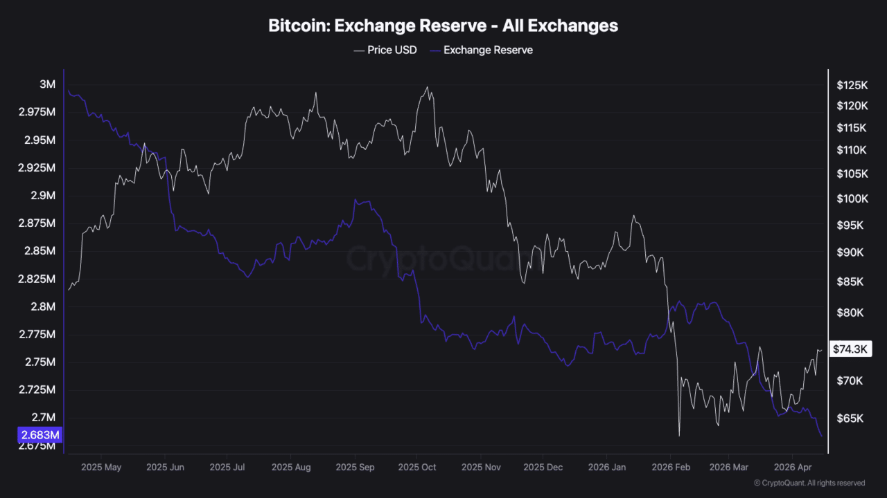 - Bitcoin exchange reserves have dropped to 2.683 million $BTC.