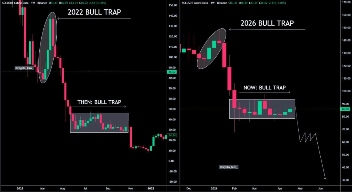 The left side shows the 2022 pattern. After the bull trap, $SOL dropped hard, moved into a boxed consolidation range, and then broke lower again. The right side places the current market in a similar box after a steep decline from the recent high. Because of that, the post suggests the current rebound is not a true recovery but a temporary pause before another leg down.