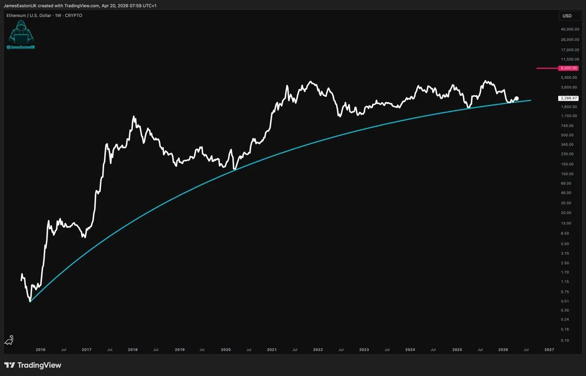 James argues that Ethereum can still reach $8,000, and the chart shows why that view remains active. On the weekly chart, $ETH is sitting near a rising long term trendline that has supported the market through several major cycles since 2016.