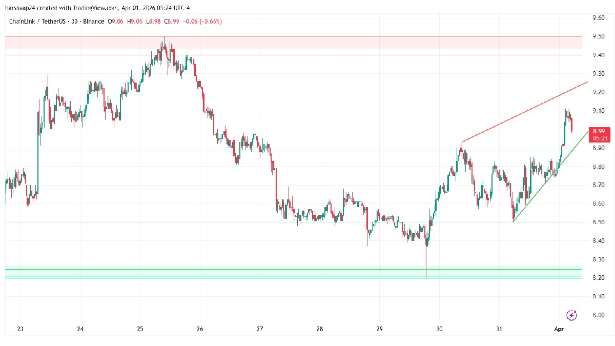 The 30-minute Chainlink price chart reveals a recovery after touching recent weekly lows. The $LINK token established a robust ascending support trendline (marked in green) that has successfully guided the price through several localized pullbacks. Currently trading at approximately $8.99, $LINK has recorded a 4.7% gain over the past 24 hours, effectively offsetting a portion of its 4.1% weekly drawdown.