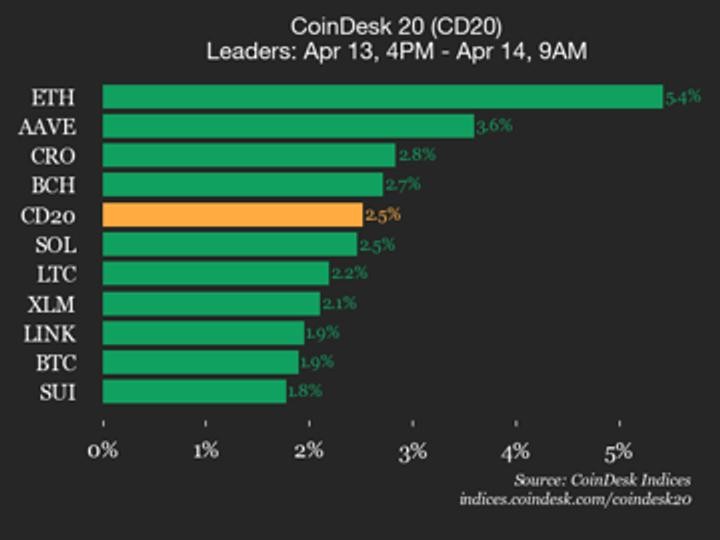 CoinDesk 20 performance update: Ethereum (ETH) price rises 5.4%