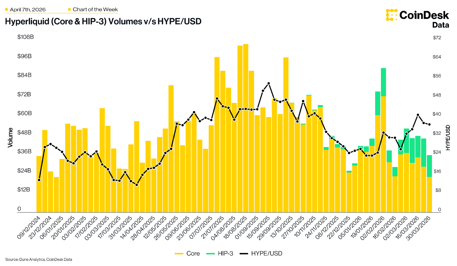 Hyperliquid’s HIP-3 has scaled from ~$115 million in its first week (Oct 2025) to a peak of $17.8 billion/week, now consistently representing 35–40% of total protocol volume. Despite launching as a crypto-adjacent product, HIP-3 is overwhelmingly a TradFi venue, with Commodities alone driving ~60% of volume and pure crypto categories accounting for just ~12%. The aggregate (core + HIP 3) volume continues to decline since the early March 2026 peak with the HYPE price now following the same trend.