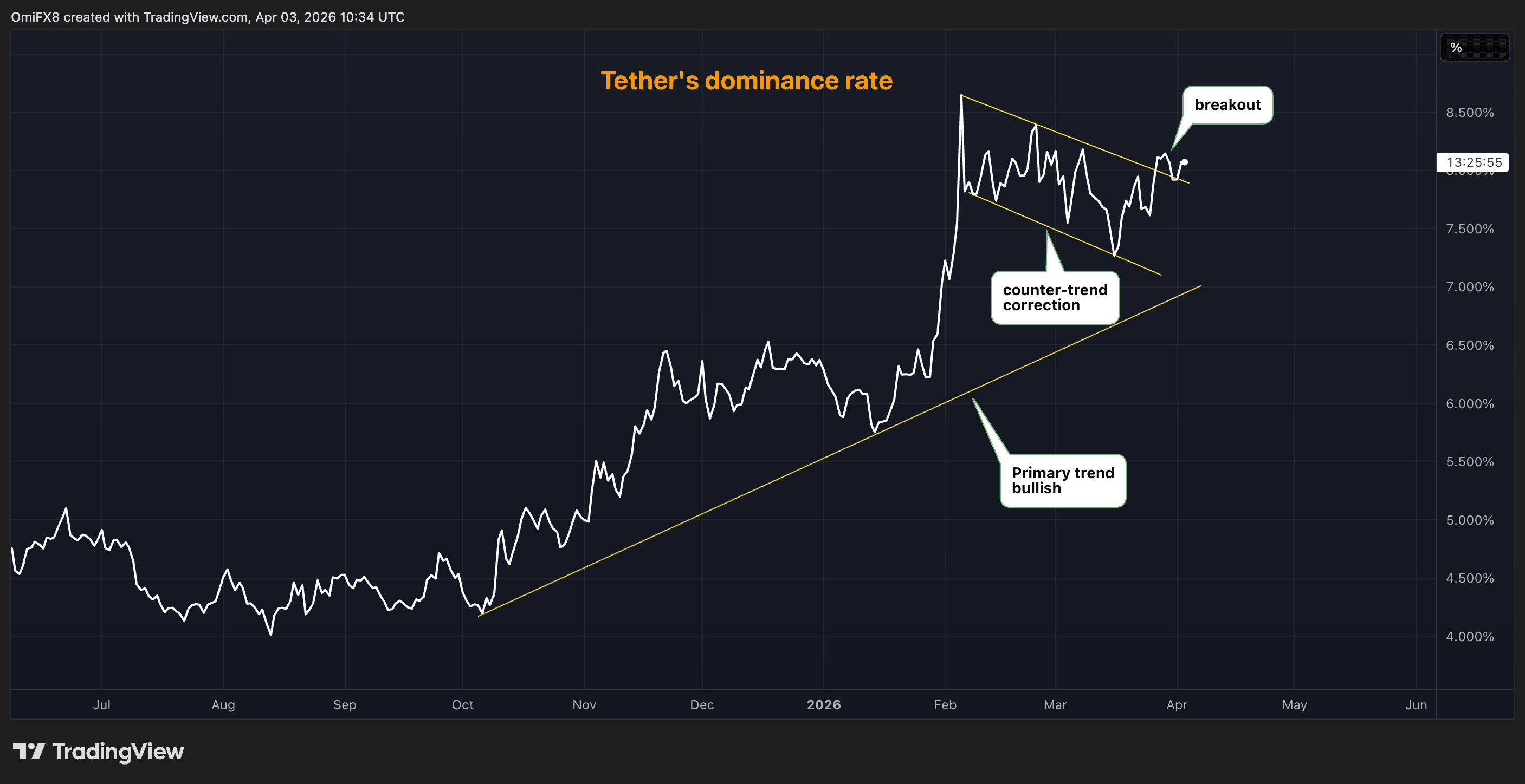 • The dominance rate is rising again after a temporary pullback, or counter-trend correction. This breakout suggests that the broader uptrend in dominance has likely resumed.