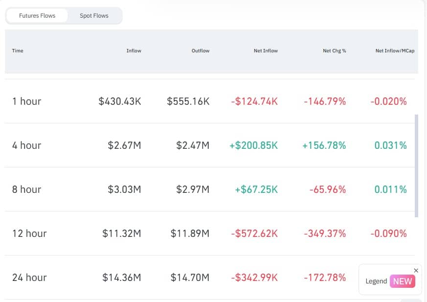 At the same time, Futures outflows increased, rising to $14.7 million, while inflows dropped to $14.36 million. As a result, the futures net flow declined by 172% to -$342k, indicating aggressive selling activity.