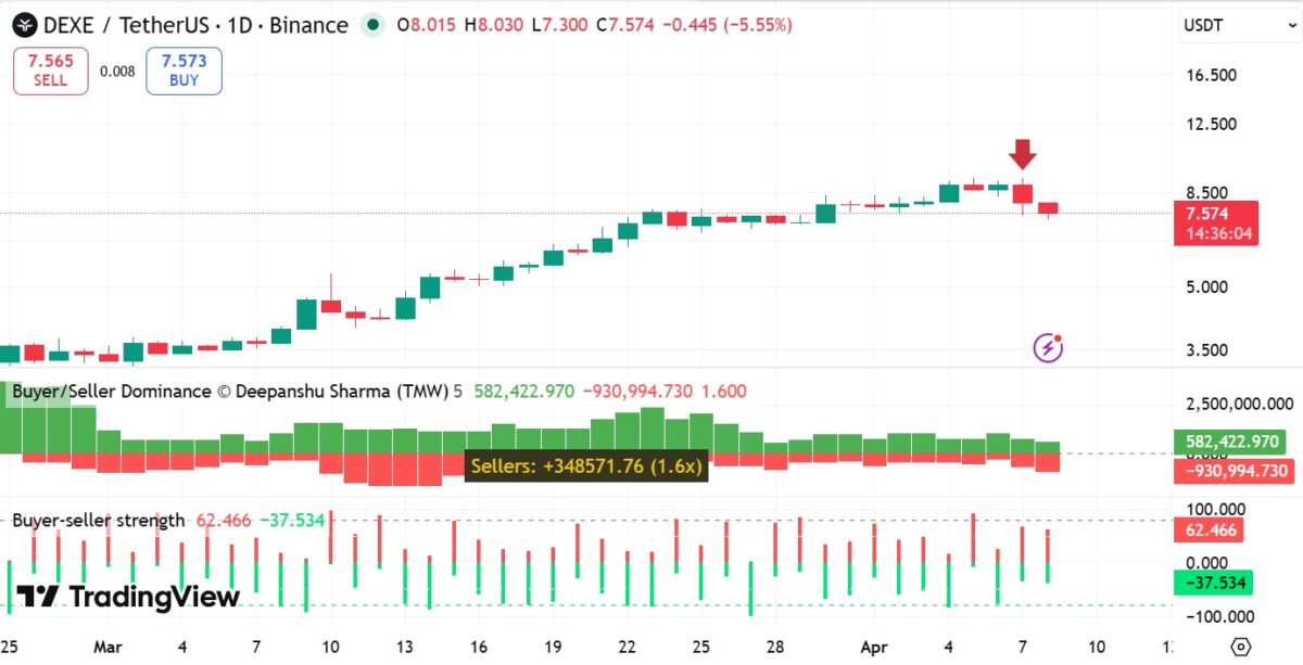 The altcoin dropped from $9.2 to $7.3 after losing the $8 support level. At press time, Dexe [$DEXE] traded at $7.6, down 15.27% daily. The weekly loss stood near 8%.