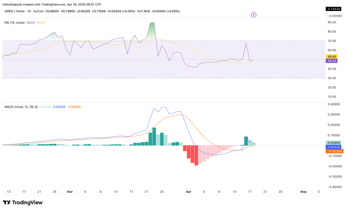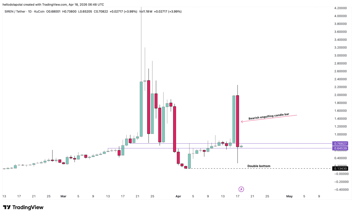 Price has now retreated into a key support zone between $0.76 and $0.64. This range previously underpinned $SIREN’s rally in March 2026, when the asset drew significant market attention.