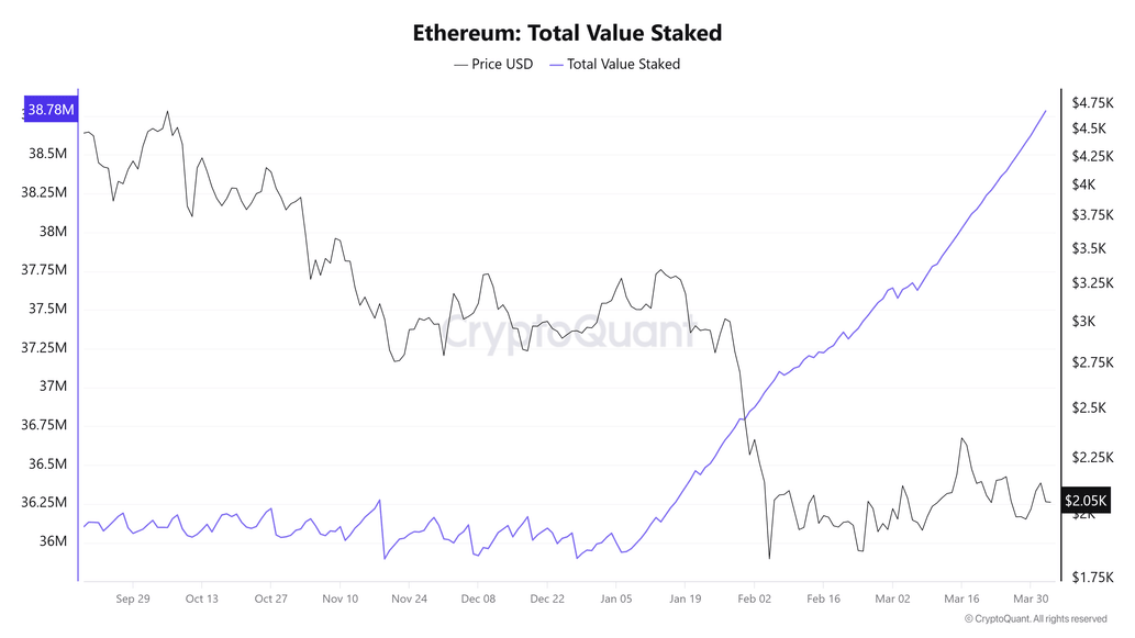 Despite clear indications of distribution, Ethereum has seen strong inflows into staking contracts, with the total amount of staked $ETH rising by 1 million $ETH over the past month.
