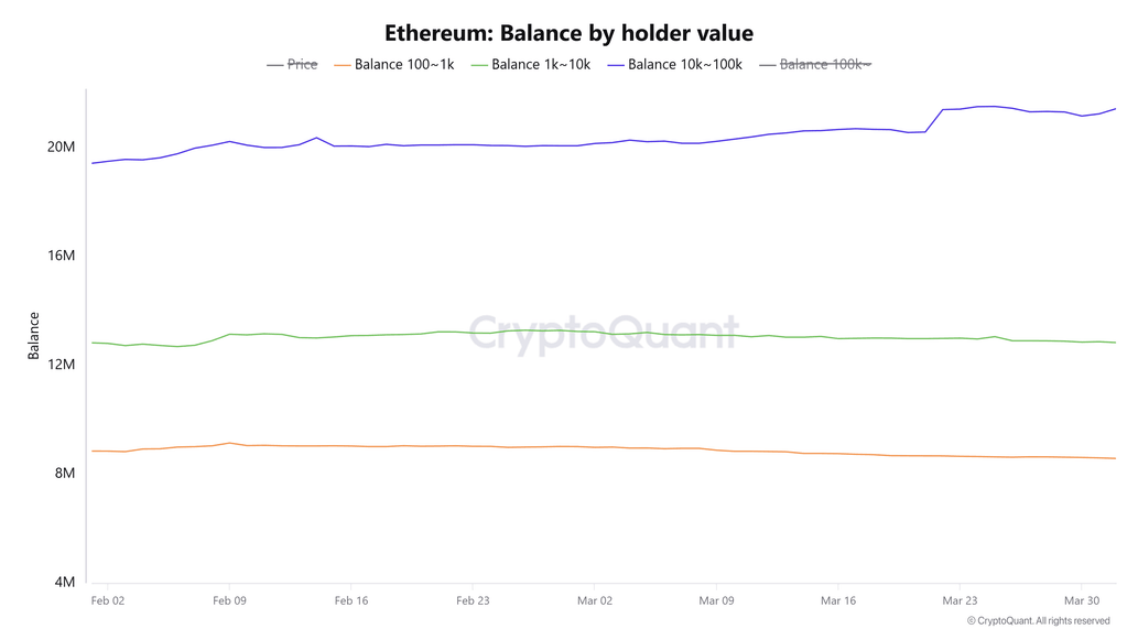 Whales or wallets with a balance of 10K-100K, which have been major buyers throughout the recent downtrend, offloaded 340K $ETH between March 24-30. However, whales flipped back to buying on Tuesday, scooping 270K $ETH across the past two days.