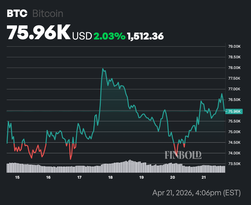 By press time, Bitcoin was trading at $75,964, up about 1% over the past 24 hours, while on the weekly timeframe, $BTC has gained 2%.