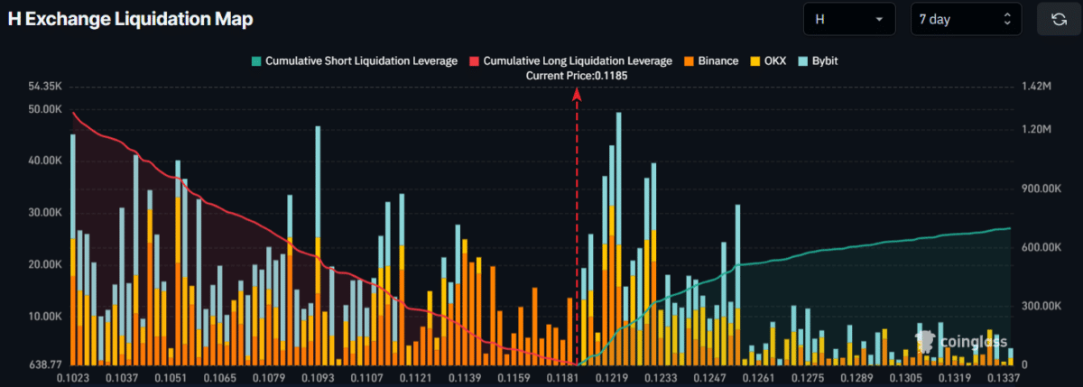 As of this writing, H was trading at $0.118, up 12.30% over the past 24 hours. Despite the price gain, market participation appeared to be hesitant, as evidenced by the trading volume, which declined by over 7.55% to $25.71 million.