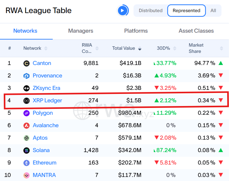 - XRPL already holds $2 billion in real-world assets and $1.5 billion in represented RWAs, ranking among the top networks.