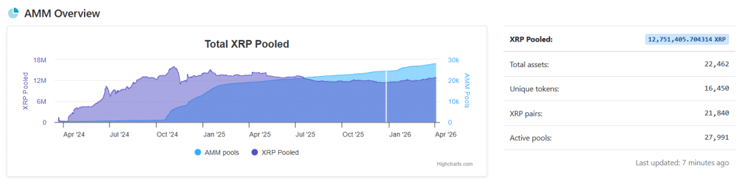 The network now has 27,991 active AMM pools, with 22,462 assets and 16,450 unique tokens. Out of the active trading pairs, 21,840 pairs involve $XRP, with about 12.751 million $XRP currently locked across these pools.