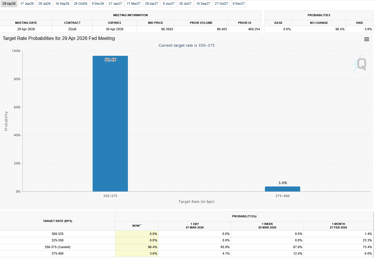 The CME FedWatch Tool now shows a 96% probability of no rate change at the April meeting, with rate-hike odds rising in tandem.