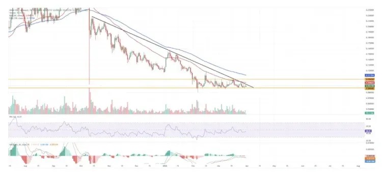 Support at $0.088 has held through several tests. That level is now the foundation of the current consolidation phase. A daily close below it would likely accelerate selling toward the upper $0.08 range and shift sentiment sharply negative.