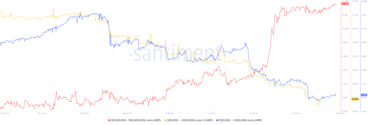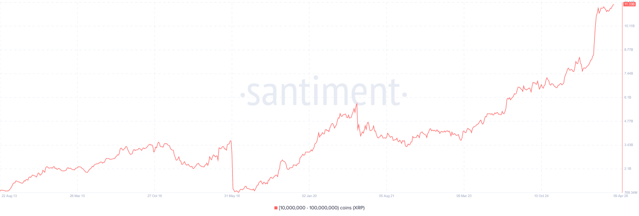 - $XRP whales holding between 10 million and 100 million tokens have increased their balance to 11.3 billion $XRP.