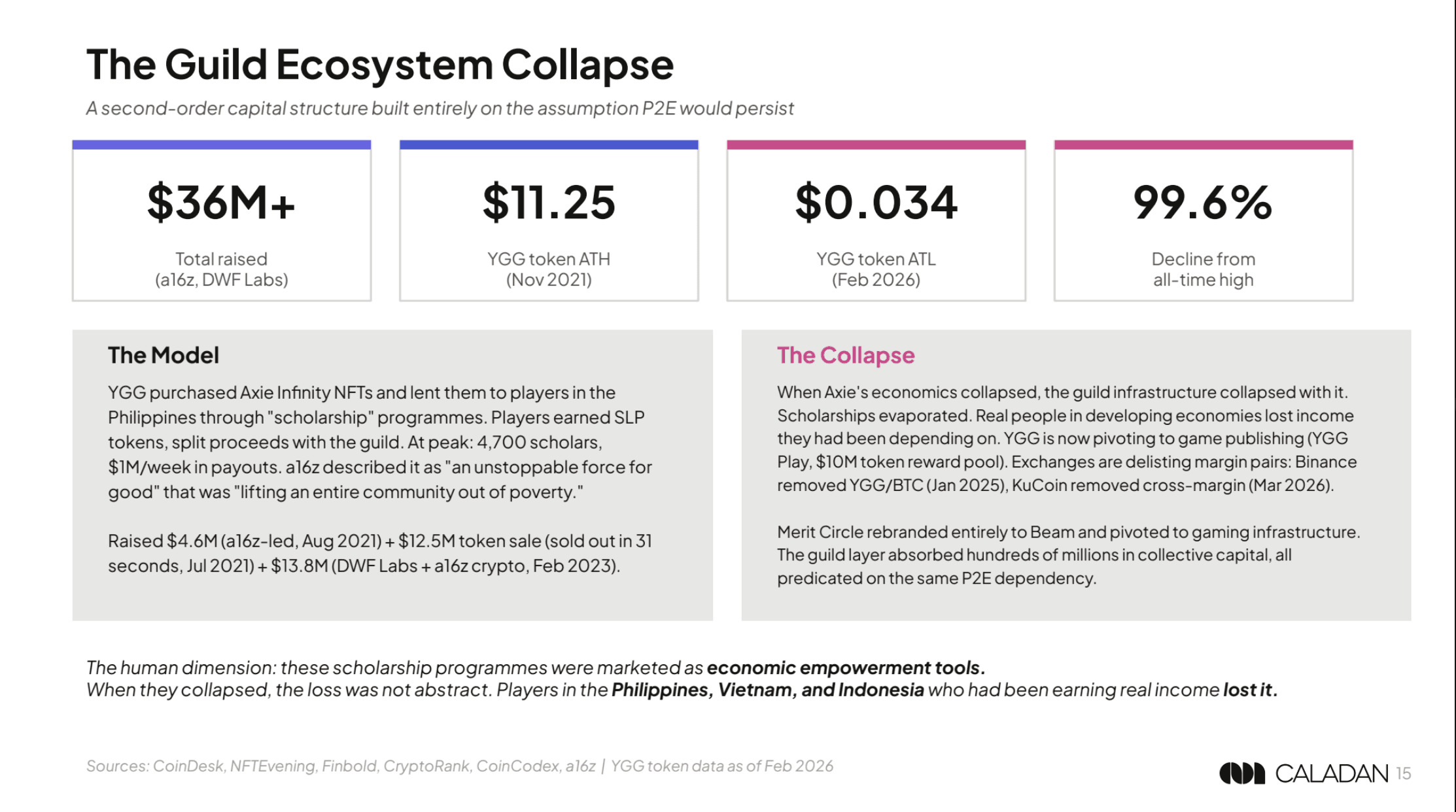 “Capital was destroyed at every layer simultaneously,” the report states, pointing to venture capital, retail $NFT buyers, gaming guilds and Telegram’s 300-million-user tap-to-earn wave as parallel casualties. Hamster Kombat alone lost 96% of its users within six months of launch. YGG, the flagship gaming-guild token, trades 99.6% below its November 2021 peak.