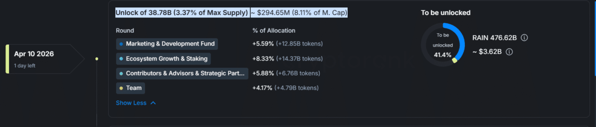 $RAIN’s setup shifts as a large supply event approaches, and the market begins to price it in early. On the 10th of April, about 38.78 billion $RAIN tokens worth $294.36 million will be unlocked.