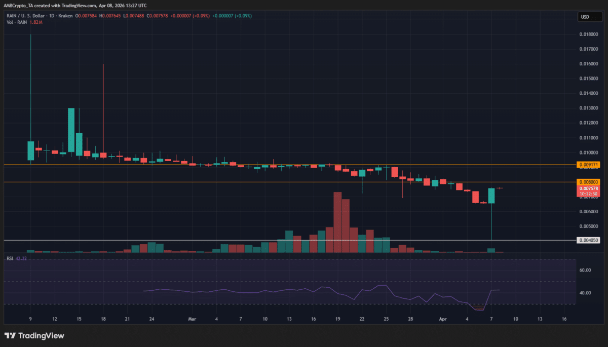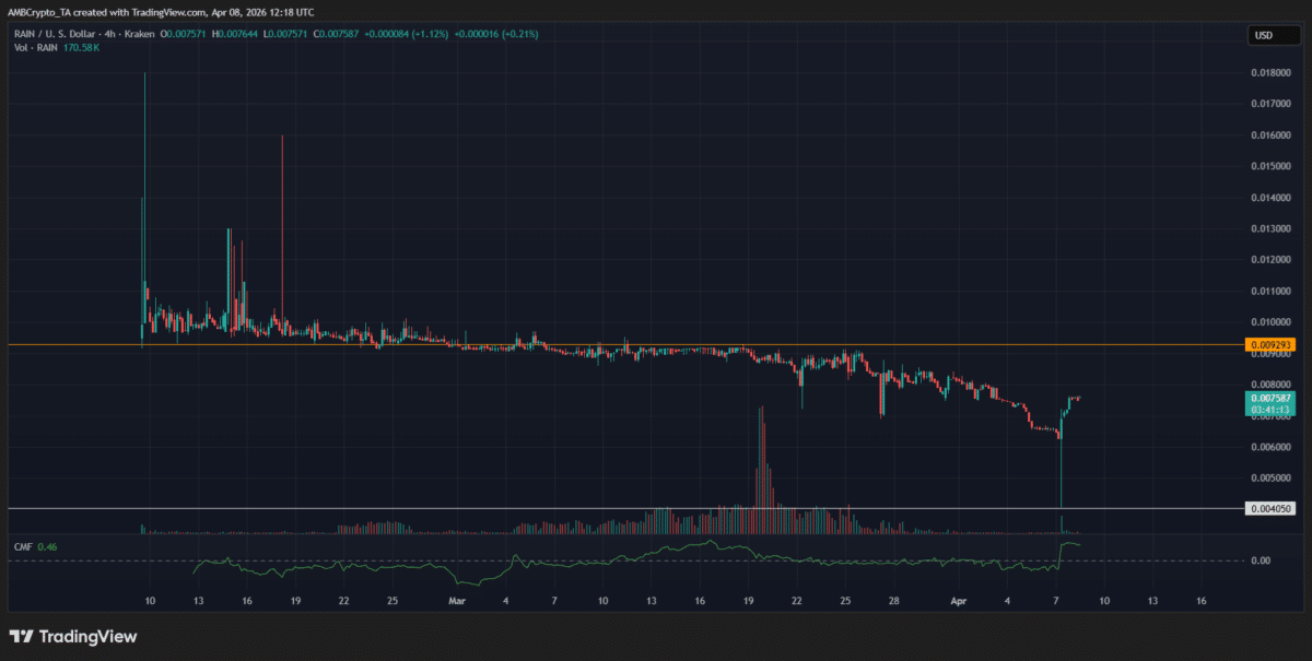 The sell-off then deepened into early April, with $RAIN sliding toward the $0.0060–$0.0065 area before a sharp flush briefly touched the $0.004050 support.