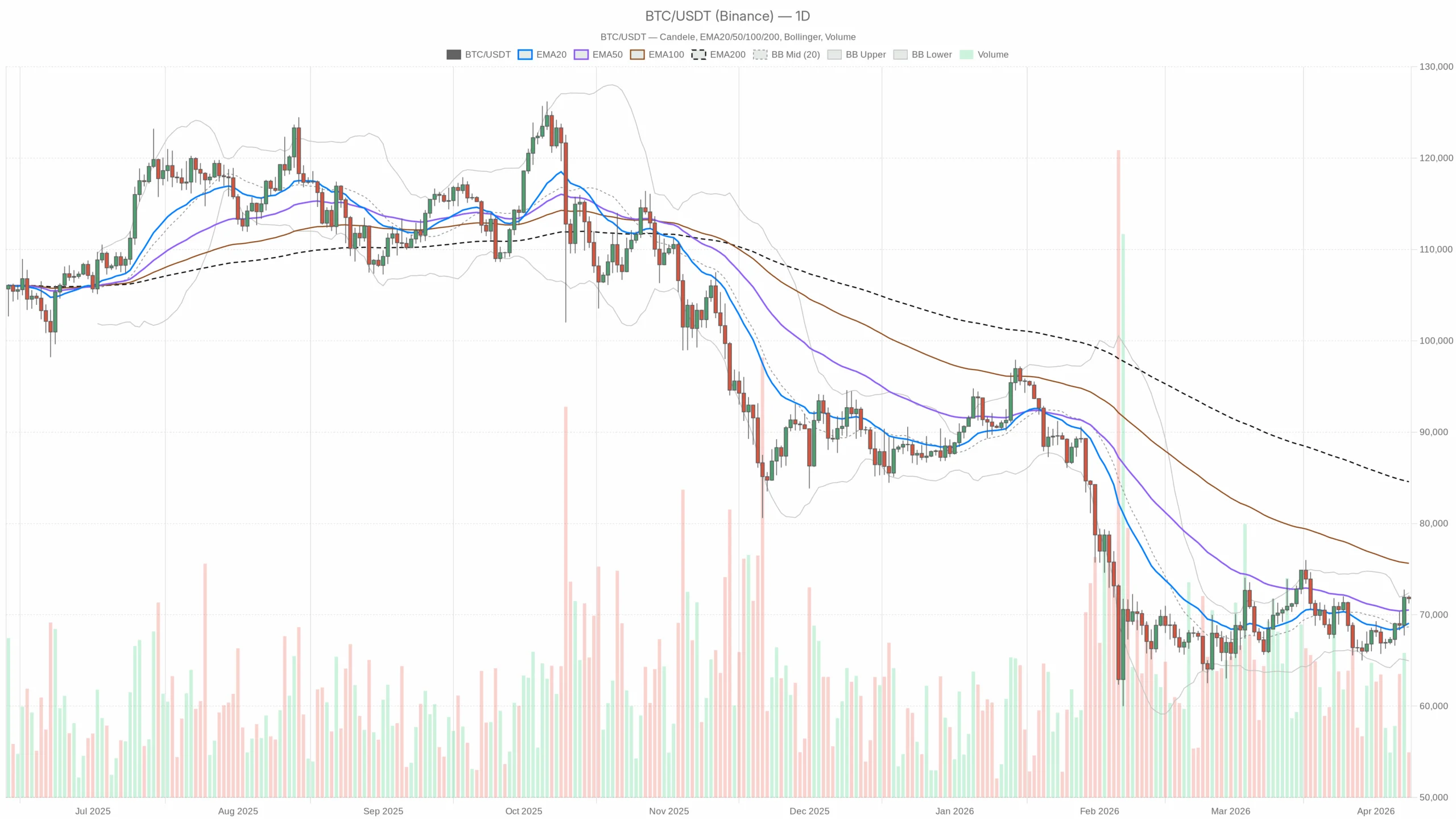 Price is hovering just under the upper daily Bollinger Band around $72,408. That tells you we are at the top of the recent volatility envelope after a strong push. Daily ATR around $2,313 means a typical daily swing is roughly 3–3.5% of price right now, which is elevated but not panic-level.