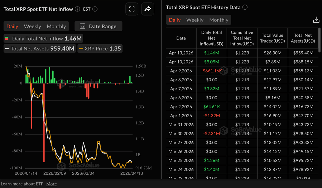 Cumulative inflows now stand at $1.22 billion, with net assets under management averaging $959 million, according to SoSoValue data. If the risk-on sentiment holds and draws investor interest, $XRP could gain momentum, driving prices above $1.40.