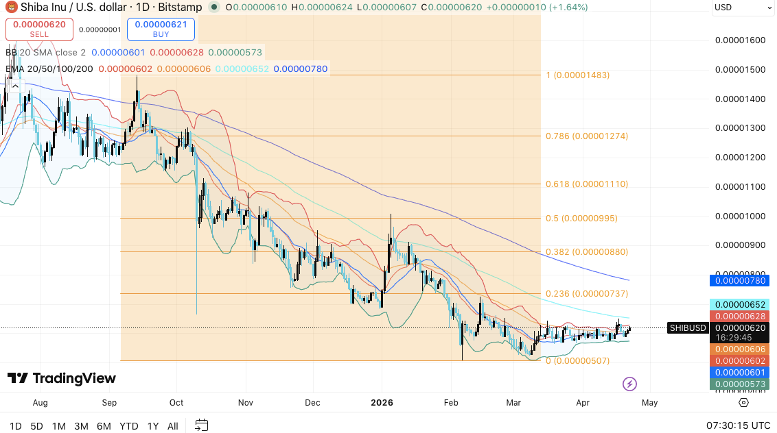 Key levels remain clearly defined as Shiba Inu consolidates near its recent range lows. Price continues to trade below major moving averages, confirming a broader bearish trend. However, tightening price action suggests early accumulation and potential stabilization.