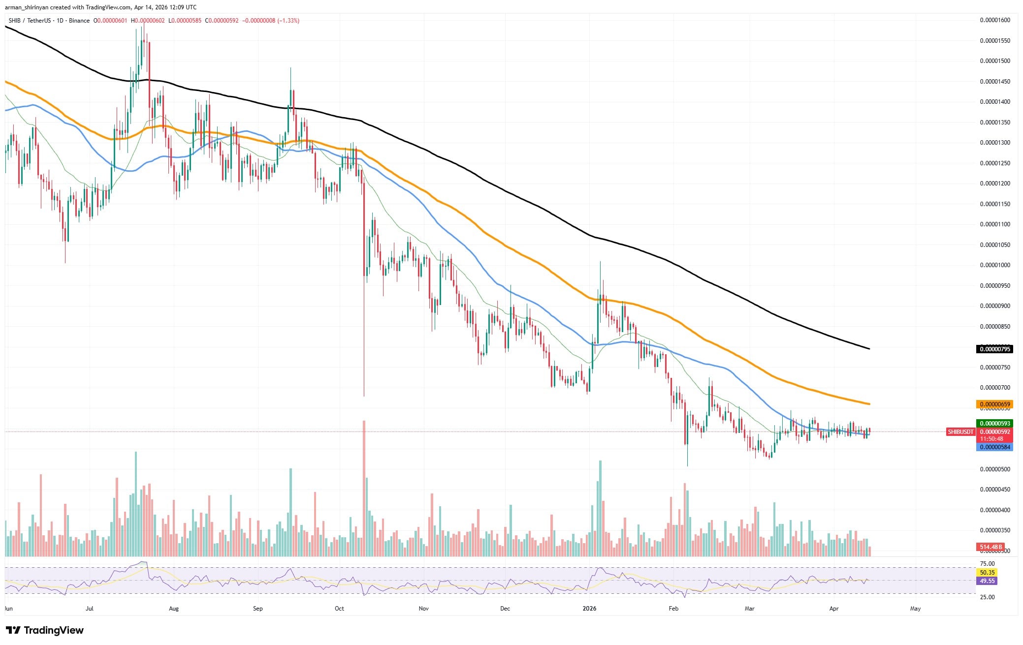 Compressed under important moving averages, $SHIB is still trading between $0.0000058 and $0.0000060, and the overall trend is still negative. Tight ascending support is forming on the chart, resembling previous consolidation phases, but there is no breakout confirmation.