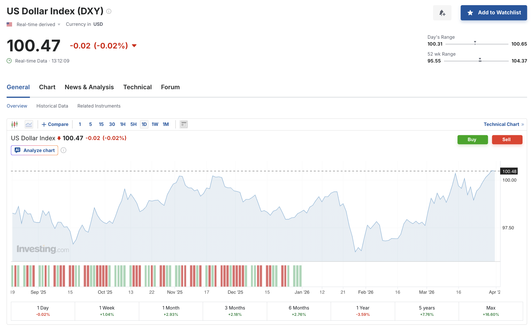 The US Dollar Index (DXY) remains above 100 and has gained roughly 3% over the past month, driven by the ongoing Iran conflict pushing oil prices higher and strengthening the greenback through the petrodollar chain. A stronger dollar typically pressures silver prices by making the metal more expensive for international buyers.